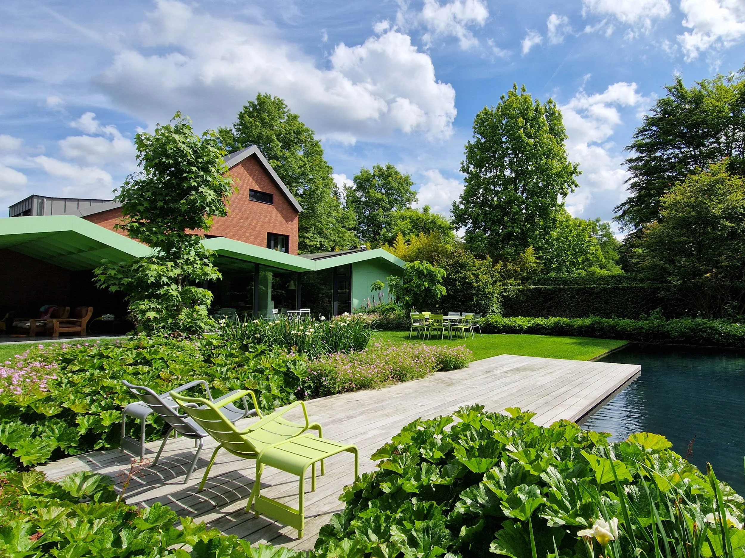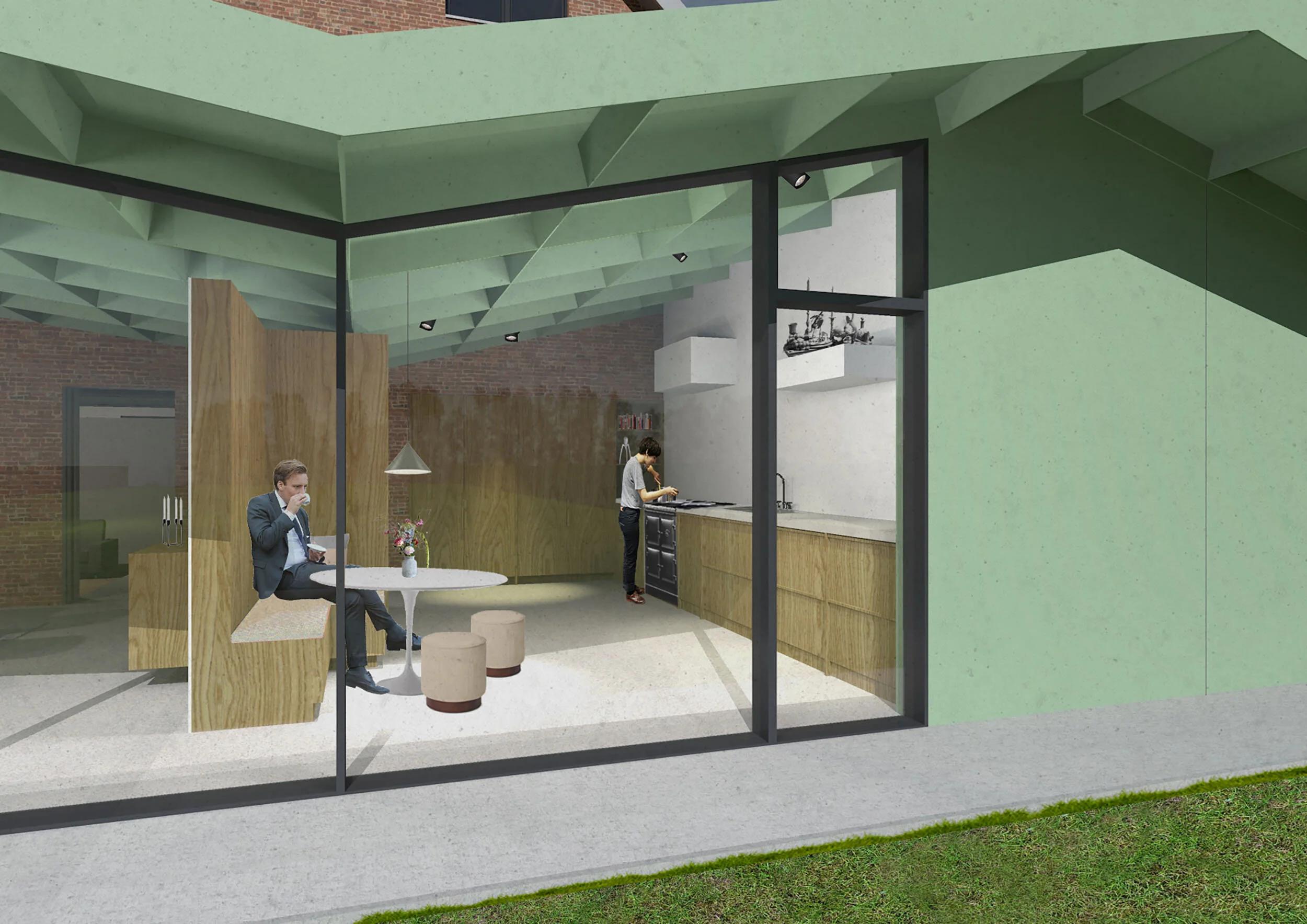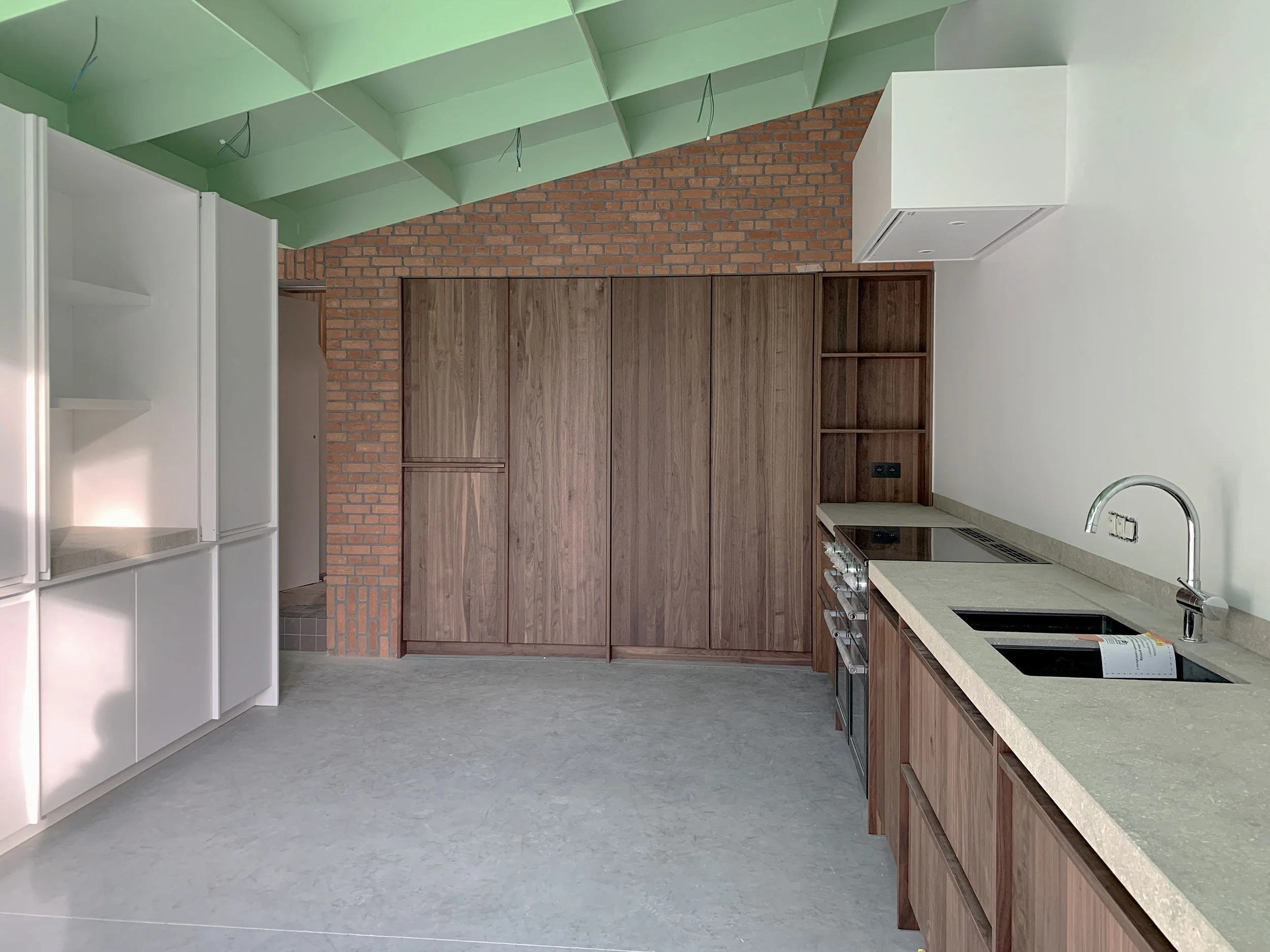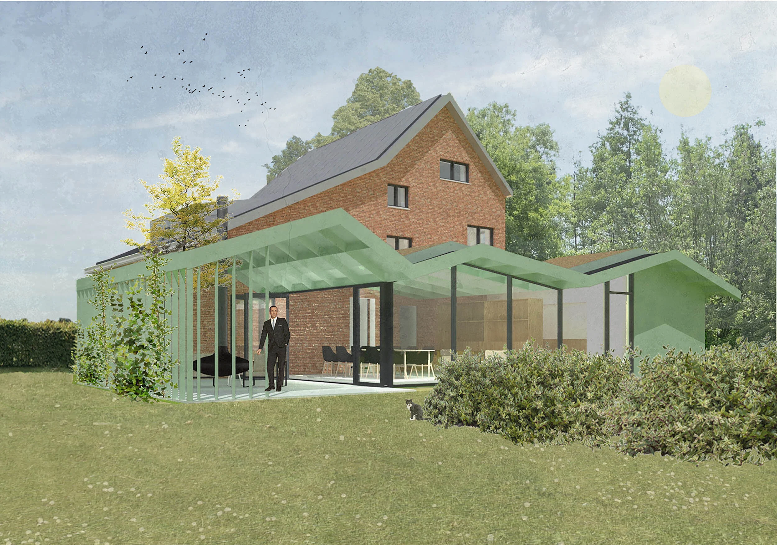 De woning was ooit een boerderij, omringd door velden. De voorgevel straalt een liefde voor baksteen en oog voor detail uit. De schuine daken van het oorspronkelijke gebouw dienden vroeger voor het opslaan van hooi en het kweken van serregroenten. Achteraan is de woning uitgebreid met een stalen constructie, die als een paviljoen in de tuin fungeert. Deze uitbreiding herbergt een nieuwe keuken, eetkamer en een overdekt terras.